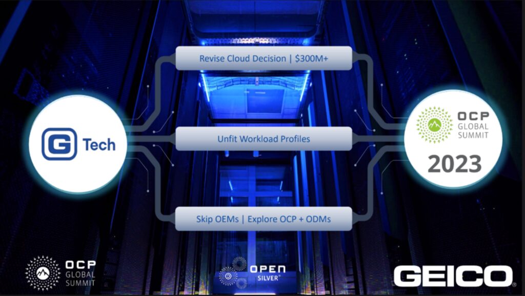 During the 2024 Open Compute Project (OCP) Global Summit, a keynote was given by GEICO outlining the reasons why in 2023 they made the decision to reverse direction for their compute infrastructure and move it back from the cloud to on-premises. Server and storage resources had become unfit, with unfit profiles for GEICO workloads while escalating costs for those resources made the cloud model impractical for their business.
